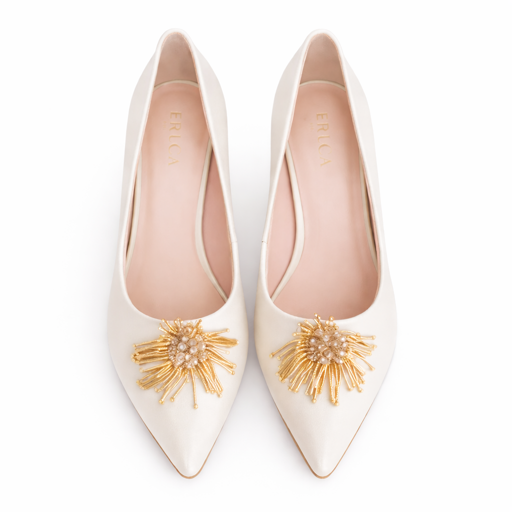 Design: Vârf ascuțit, cu aplicație decorativă sofisticată în nuanță aurie, ce adaugă un accent rafinat și feminin.