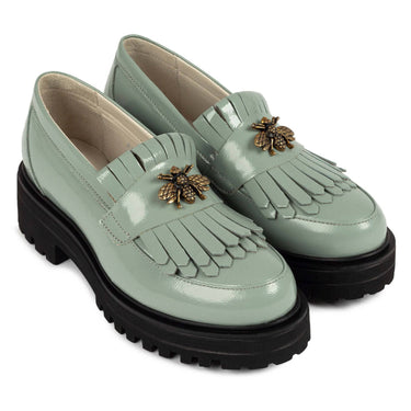 Pantofi damă cu franjuri și accesoriu metalic, model albinuță confecționați din piele naturală. Calapodul este confortabil. Talpa este înaltă.