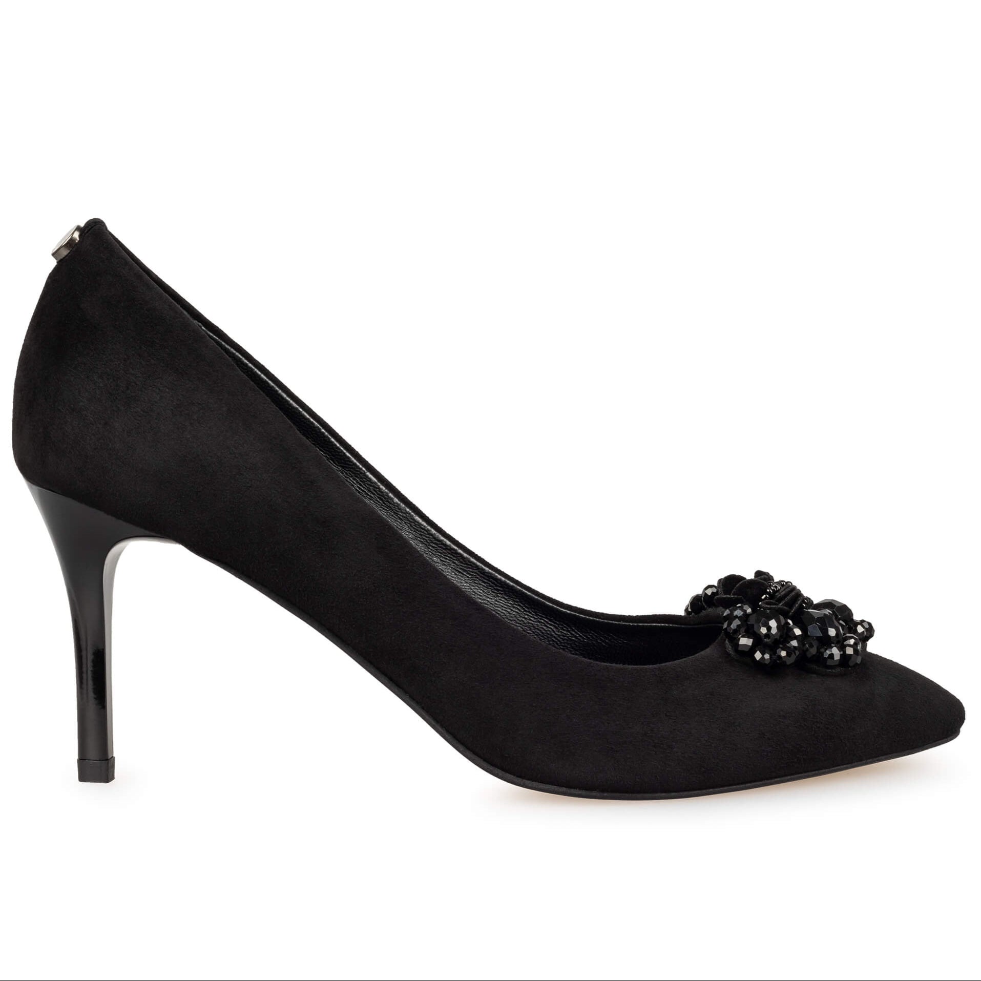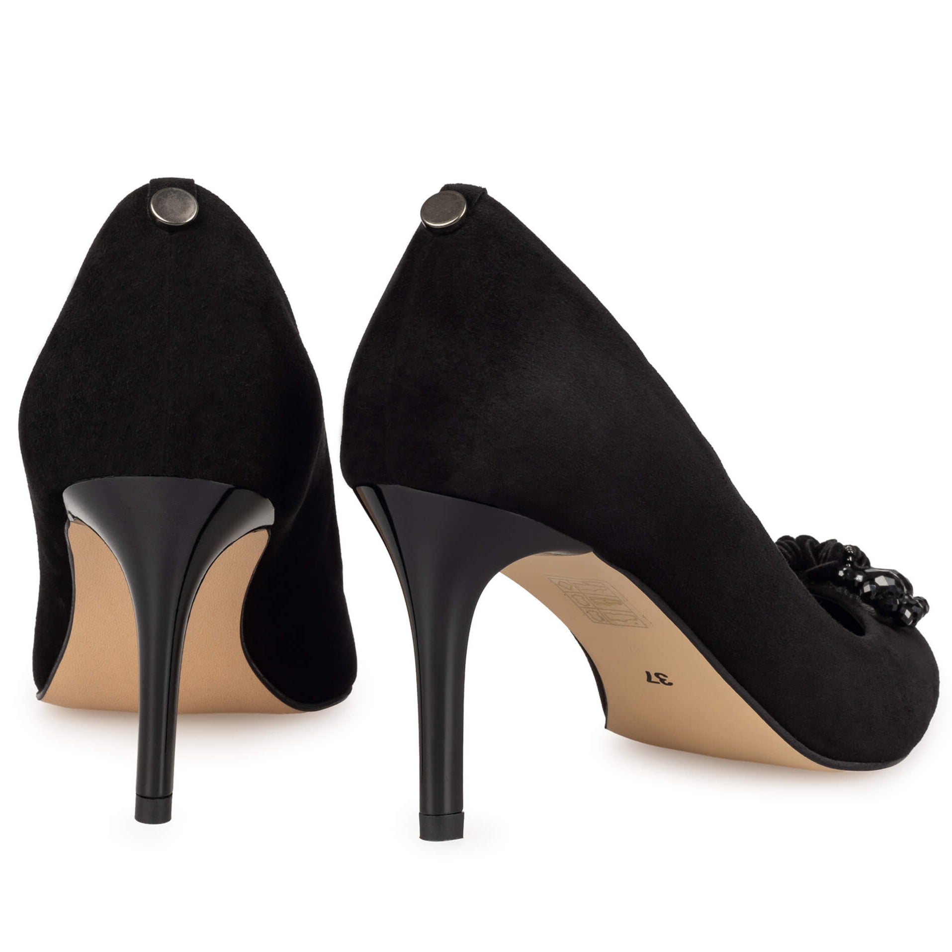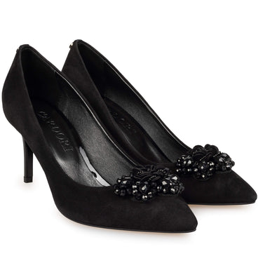 Pantofi damă eleganți cu pietre negre și toc de 7 cm, realizați din piele naturală interior și exterior.