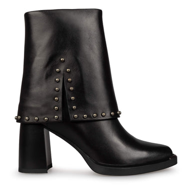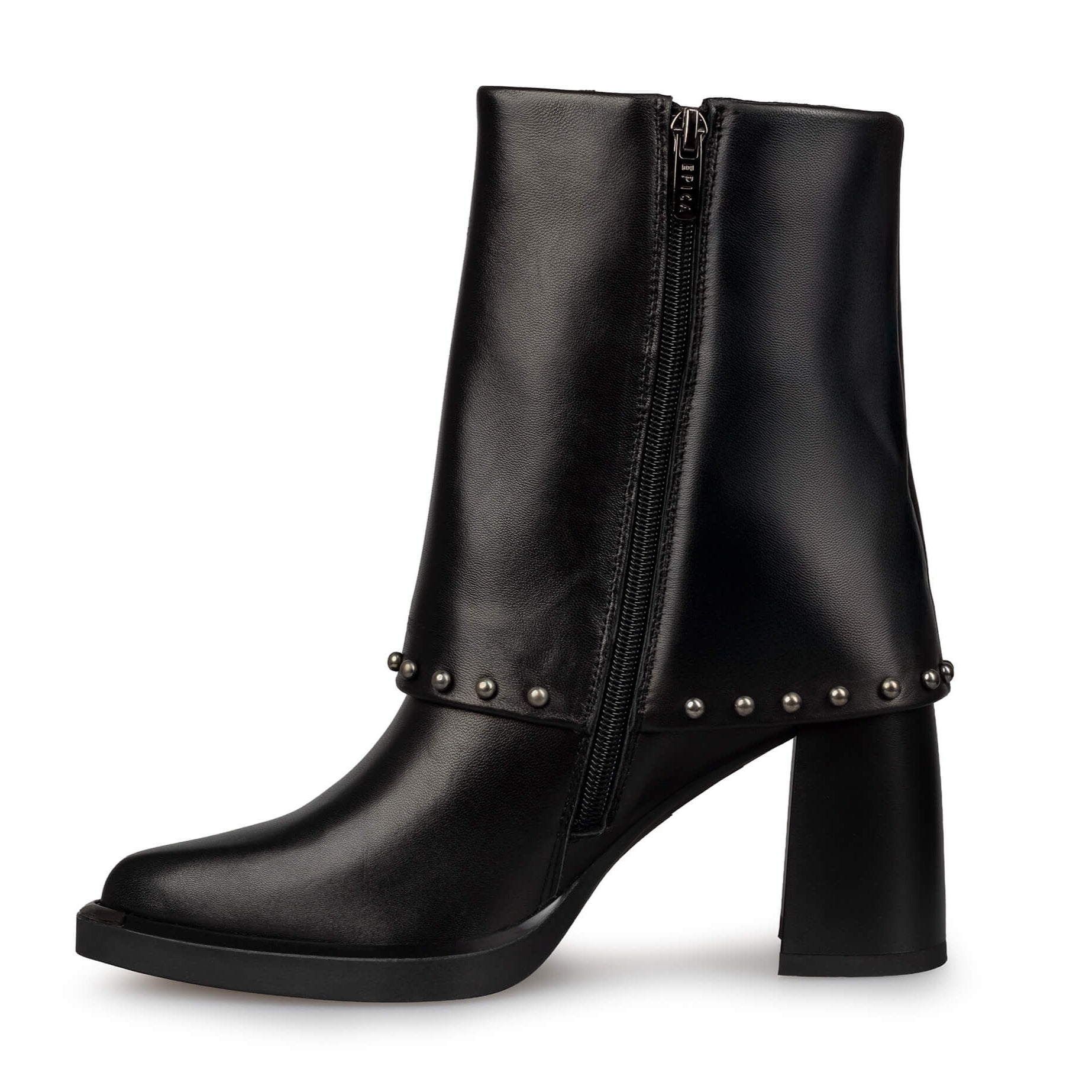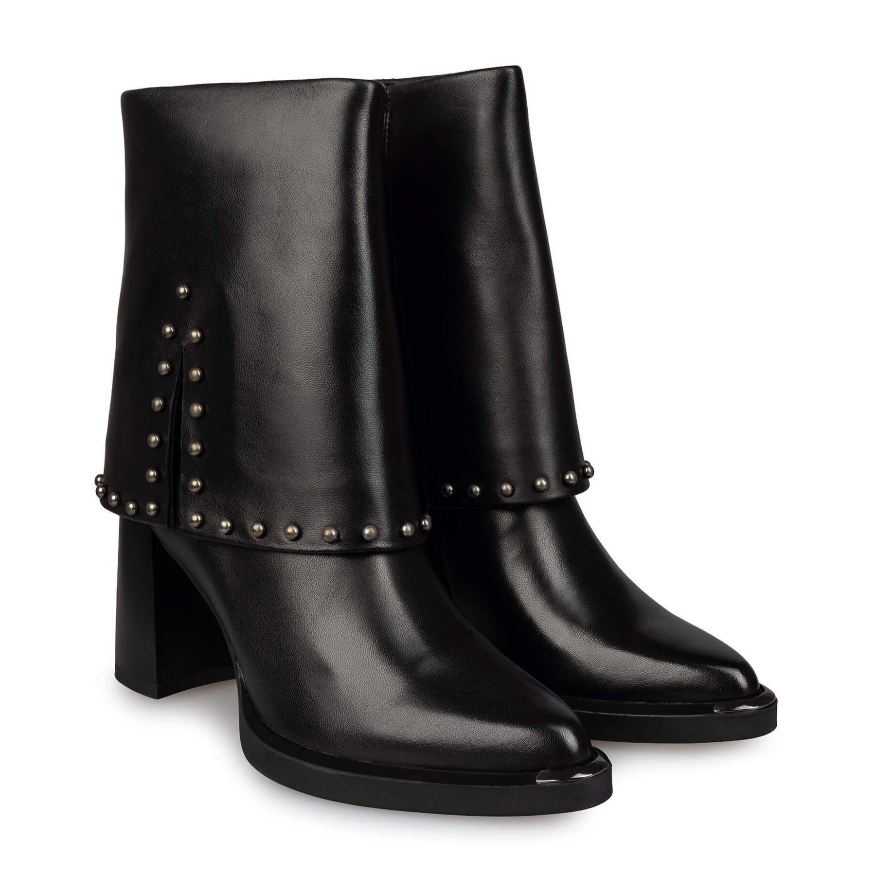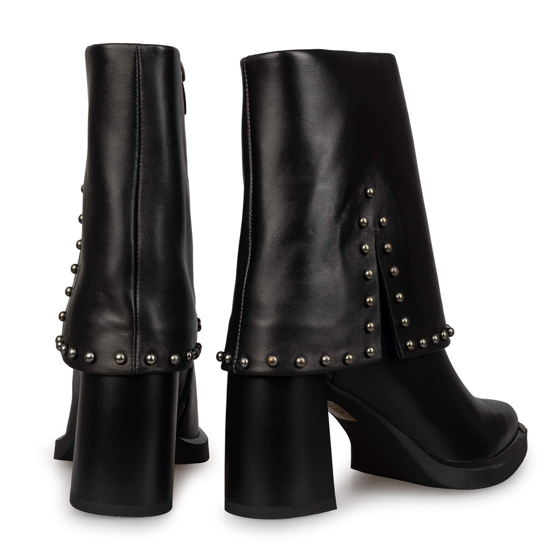 Aceste botine reprezintă combinația perfectă între stilul statement și calitatea premium. Confecționate din piele naturală neagră, ele ies în evidență prin manșeta ajustabilă, decorată cu ținte metalice discrete, adăugând un aer rock-chic oricărei ținute.