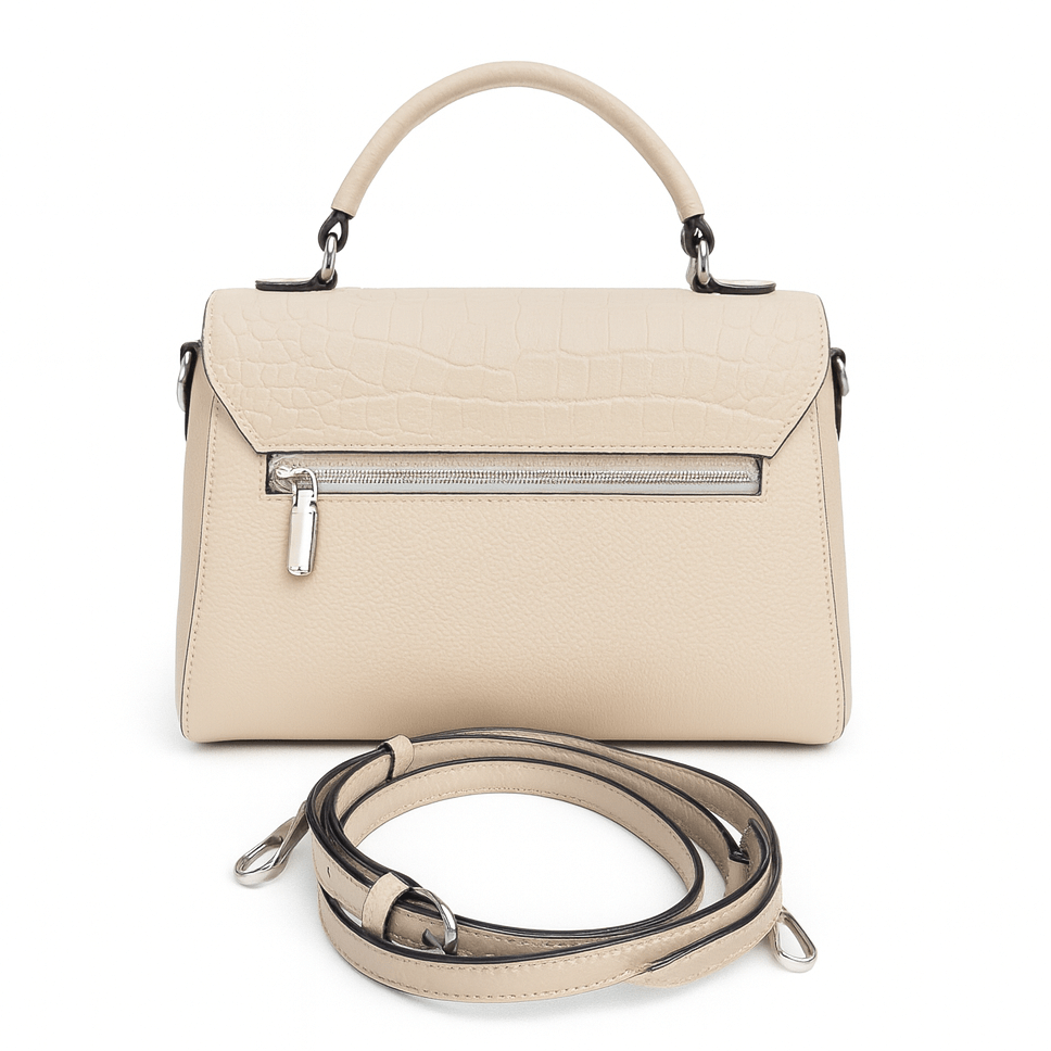 Partea superioară prezintă o clapetă cu imprimeu crocodile , iar baza este din piele naturală cu textură fină, oferind rezistență și un aspect premium. Sistemul de închidere metalic adaugă un plus de rafinament și siguranță.