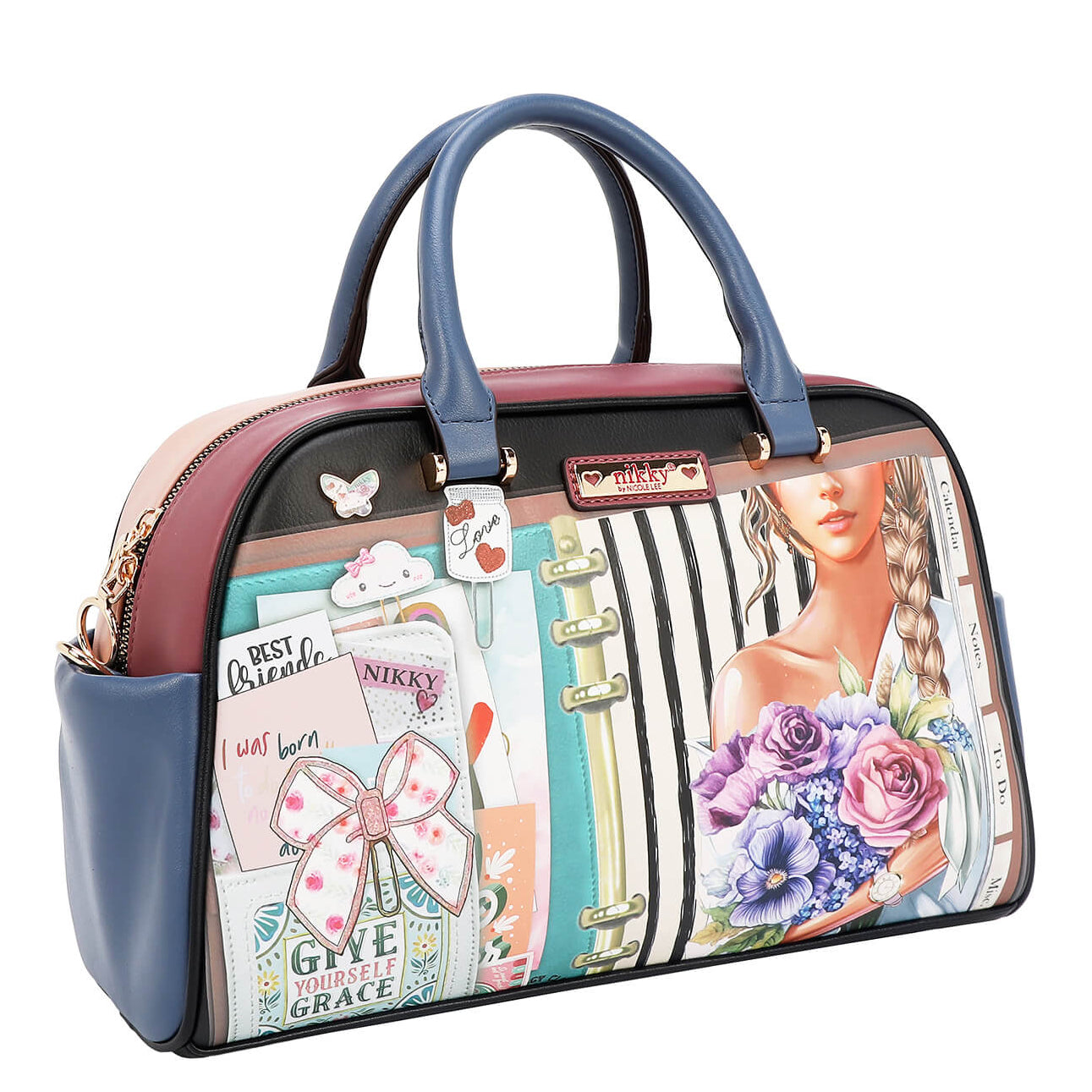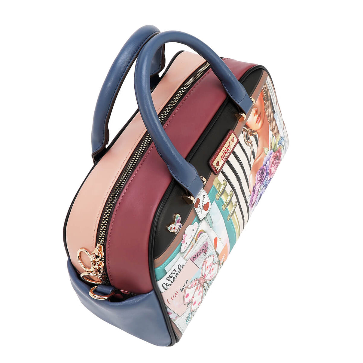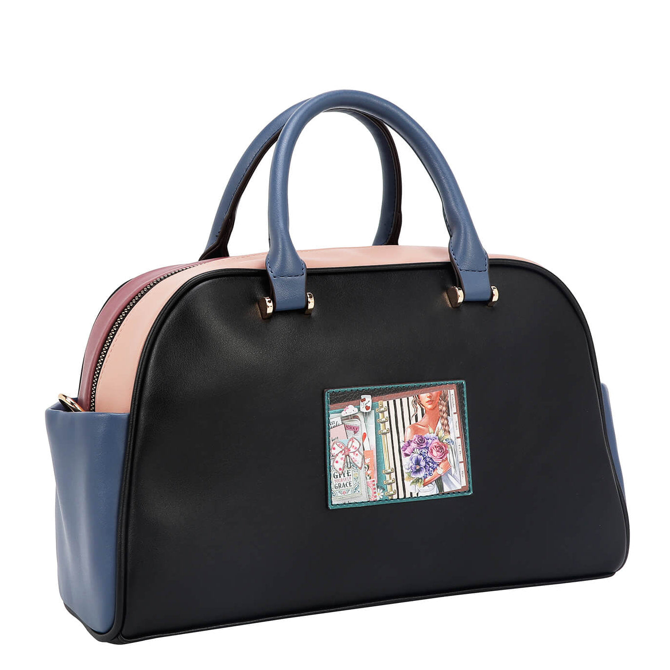 Mânere duble din piele ecologică, rulate în partea superioară.